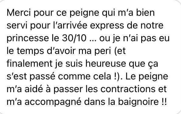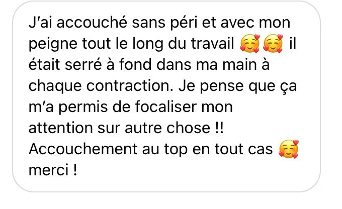 Donc en serrant le peigne fort dans ta main, tu crées une deuxième douleur qui te fera sécréter encore plus d’endorphine pour supporter tes contractions.